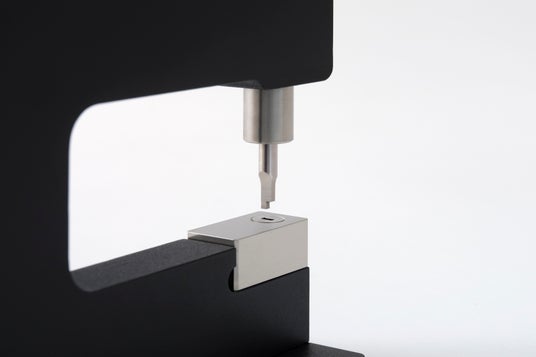 軽い力で、心地よく加工を続けられる。わずかな力で大きな力を生むトグルリンク機構の採用により、軽い操作で板金の打ち抜き加工が可能です。さらに、前機種からハンドルの角度と長さを見直すことで、卓上作業でも快適な操作感を実現しました。1mm 厚のアルミ板を抜く際に必要な力は約 3.5kg 程度で、作業時の負担を抑え、心地よく加工を続けることができます。