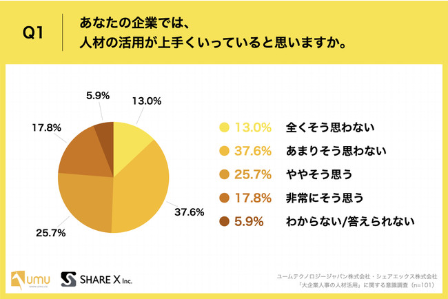 「Q1.あなたの企業では、人材の活用が上手くいっていると思いますか。」(n=101)と質問したところ、「全くそう思わない」が13.0%、「あまりそう思わない」が37.6%という回答となりました。