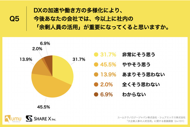 「Q5.DXの加速や働き方の多様化により、今後あなたの会社では、今以上に社内の「余剰人員の活用」が重要になってくると思いますか。」(n=101)と質問したところ、「非常にそう思う」が31.7%、「ややそう思う」が45.5%という回答となりました。