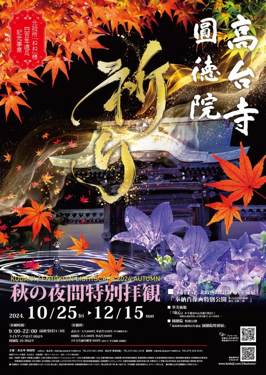 北政所ねね様四百年遠忌を記念して、他者の幸せを祈ることで心の内面にある様々な執着から生まれる喜怒哀楽といった感情を超越し自らが救われることで「空」の世界に至るその過程を最新のプロジェクションマッピング技術でダイナミックかつ繊細に方丈前庭“波心庭″で表現します。