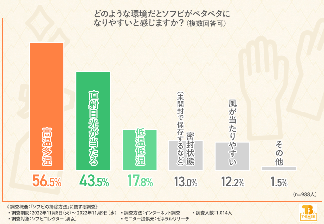 そこで、「どのような環境だとソフビがベタベタになりやすいと感じますか?(複数回答可)」と質問したところ、『直射日光が当たる(56.5%)』と回答した方が最も多く、次いで『高温多湿(43.5%)』『低温低湿(17.8%)』『風が当たりやすい(13.0%)』『密封状態(未開封で保存するなど)(12.2%)』と続きました。