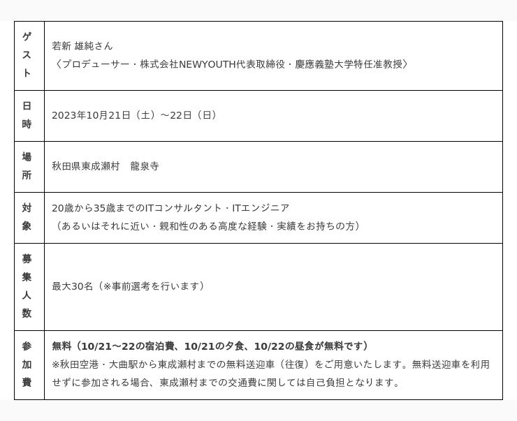 合宿ワークショップは2023年10月21日(土)から22日(日)にかけて秋田県東成瀬村の龍泉寺にて行い、参加費は無料(期間中の食事、宿泊)です。