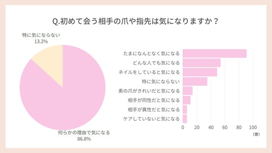 身体の部位の中でも非常に小さな「爪」ですが、仕事中やお出かけ先、家事育児の間などでふとした瞬間に目に入ることはありませんか?20~40代女性に実施したアンケートによると、何らかの理由で「初めて会う相手の爪や指先が気になる」と回答した女性は86.8%でした。