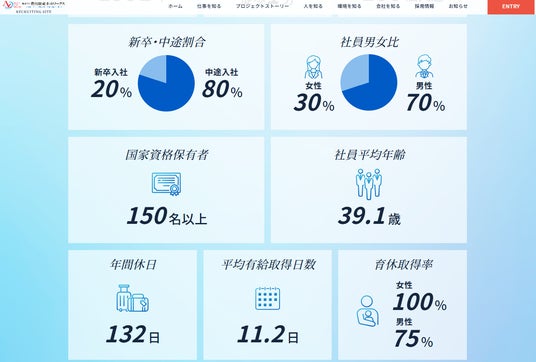 仕事のイメージや働く姿を想像できるよう、プロジェクトストーリーのページを新設しました。安心して長く働けることを伝えるため、社員構成や平均有給取得日数などを数字で見られるページや、現役社員へのインタビューページも掲載しています。