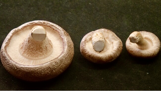 (左:黒椎茸、中:通常肉厚とされる椎茸、右:一般的な椎茸)