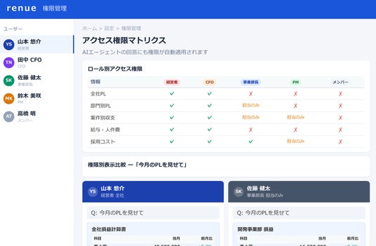 renueでは、包括的な権限管理システムを備えており、財務会計データ・管理会計データの双方に対して、ユーザーのロールに応じた細かなアクセス制御を実現しています。これは画面のアクセス制御にとどまら ず、AIエージェントが回答する情報の範囲にまで及びます。