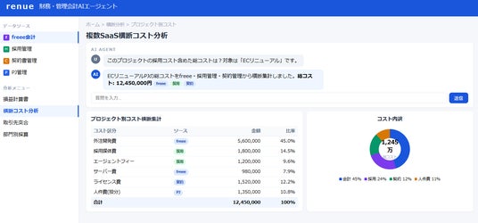 このように、renueのAIエージェントは単にfreeeのデータを表示するのではなく、複数の管理会計系SaaS から集めた業務データと財務データを結合することで、経営者が本当に知りたい「なぜ」に答える存在です。