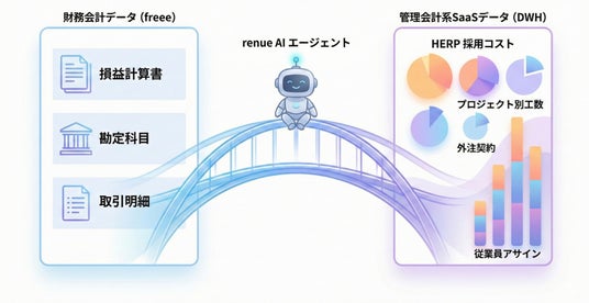 renueの財務・管理会計AIエージェントは、freeeの財務会計データ(損益計算書・勘定科目・取引明細) と、DWH上に統合された管理会計系SaaSの業務データ(HERPの採用コスト・プロジェクト別工数・外注 契約・従業員アサインなど)を紐付け、財務会計の数字に管理会計の文脈を付与する「ブリッジ」の役割を 果たします。