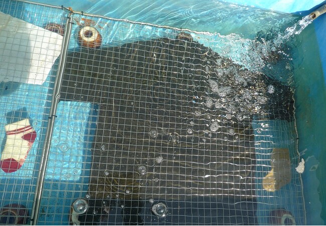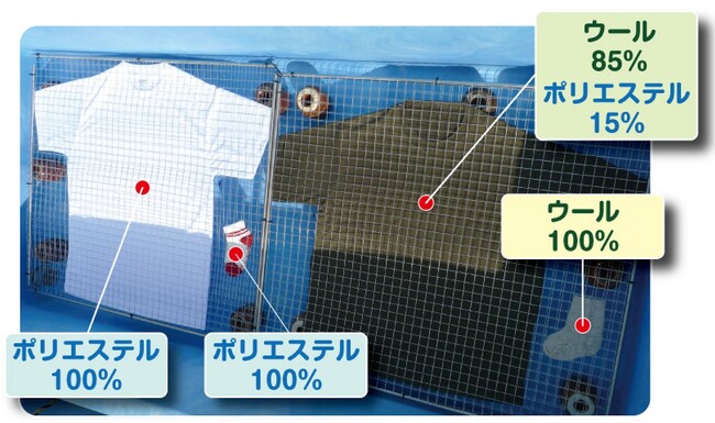 当社のポリエステル長繊維・ウール交撚糸「ニッケ アクシオ」を使ったTシャツとポリエステル100%のTシャツを生け簀の海水に150日間、浸漬させました。実験期間中の海水温度は最低9.7℃、最高24.6℃で推移し、塩分濃度は3.3%で、実際の海洋中と同じ条件となっています。