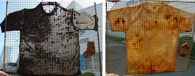 実験の結果、「ニッケ アクシオ」のウール部分はほとんどが生分解され、ポリエステル長繊維の部分だけが生分解されずにガーゼ状に残りました。ポリエステル100%のTシャツは、まったく生分解が認められませんでした。