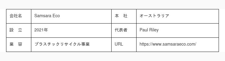 兼松株式会社(以下、「兼松」)は、この度、環境技術スタートアップ企業である豪Samsara Eco社へ出資いたしました。Samsara Eco社が実施する第三者割当増資を引き受ける方法により同社の株式を取得したもので、兼松はこの出資を通じて、近年重要な社会課題となっているプラスチックごみの削減に取り組むとともに、プラスチックリサイクル事業を通じた循環型ビジネスの確立を目指します。