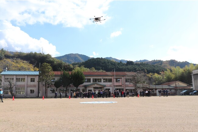 11月14日(火)の報道関係者への公開では、小学校間の交流を想定して(さくら小学校の児童の寄書を生雲小学校の児童へ配送)、ほほえみの郷トイトイからJAふれあい生雲支所までの片道約7.4kmを約16分で、また、急送品の輸送を想定して(阿東運動広場で実施されているグラウンドゴルフ大会の参加者向けの商品などを輸送)、JAふれあい地福支所から阿東運動広場までの片道5.5kmを約12分で、移動販売車へ商品の補充を想定して、JAふれあい地福支所から三谷ふれあいセンターまでの片道6.2kmを約13分のドローン配送を実施いたしました。