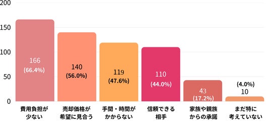 その結果、「費用負担が少ない(解体費や手数料などが高額でない)」が66.4%でもっとも多く、次いで「売却価格が希望に見合う(56.0%)」「手間や時間がかからない(47.6%)」「信頼できる買主・仲介業者に任せられる(44.0%)」が上位に挙がりました。