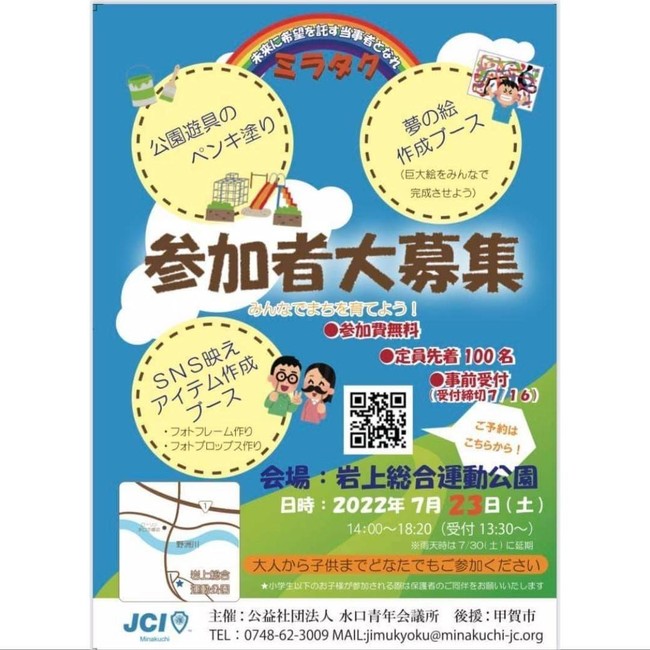 (公社)水口青年会議所と行政とまちの人が共にまちの課題を解決する事で、未来に続く持続可能なまちづくり事業を行います。また、まちの施設を修繕すること事だけで無く、まちの人が楽しみながら課題解決に携わることで、まちの関心を生み出し、自発的に活動しようと思う気持ちを呼び起こす事を目的としています。今回、まちの人と共にまちの施設を修繕することと、楽しく人と人が触れ合えるコミュニティをつくる事を新しくパッケージ化しました。