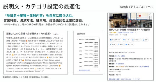 AIモードで引用される部分が、ビジネス説明文。だからこそ、「地域名+業種+体験内容」を盛り込むのがおすすめ。
