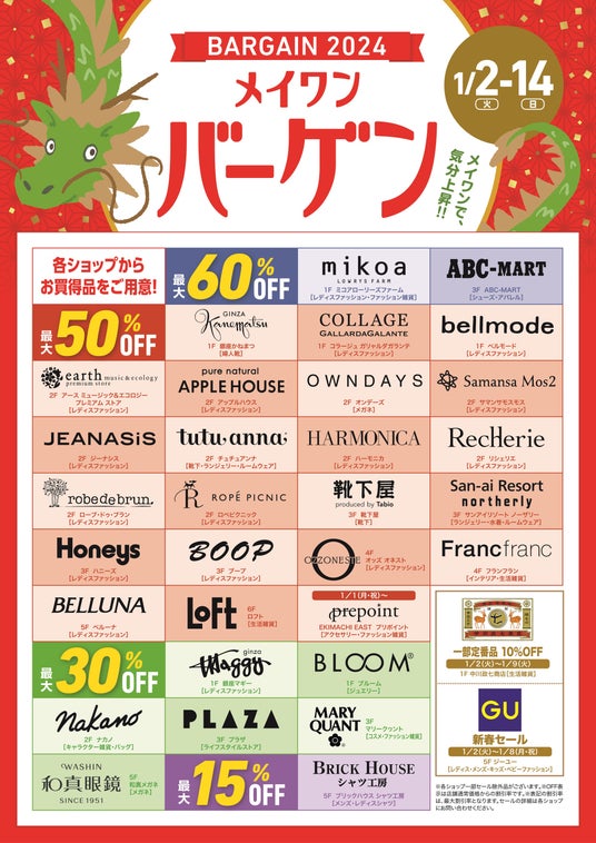 浜松駅ビルメイワンでは、1/2(火)からメイワンバーゲンを開催します。