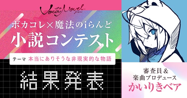 小説投稿サイト「魔法のiらんど」とボカコレのコラボ企画「VocaNovel(ボカノベル)小説コンテスト」。本コンテストでは、人気ボカロPのかいりきベアを審査員に迎え、「本当にありそうな非現実的な物語」というテーマで小説を募集し、選ばれた作品をかいりきベアが楽曲・MV化します。受賞作品は『世界五千年前仮説』(作者:さめしま)に決定し、完成した楽曲はボカコレ期間中に投稿され、ボカコレ生放送番組内でも特集します。