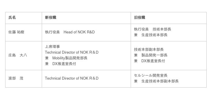 NOK R&D発足に伴う主な人事異動