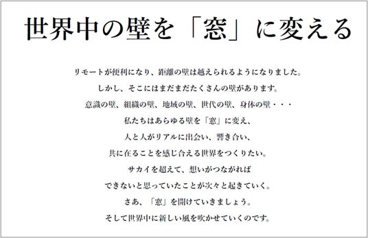 創業3年目に入り、より一層の成長を目指すとともに、改めて当社の進むべき方向を広くお伝えしたいとの想いから、このたびコーポレートミッションとして「世界中の壁を『窓』に変える」を策定しました。
