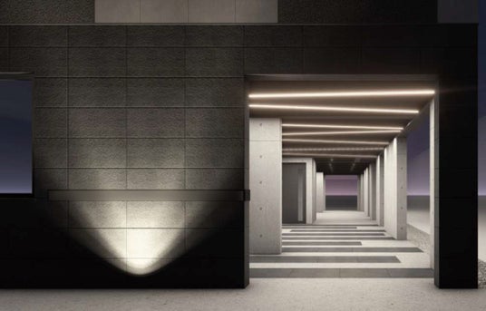 ピロティを活かした奥行きあるアプローチに、テープライトや床アクセントを採用し、空間を演出(完成イメージ)