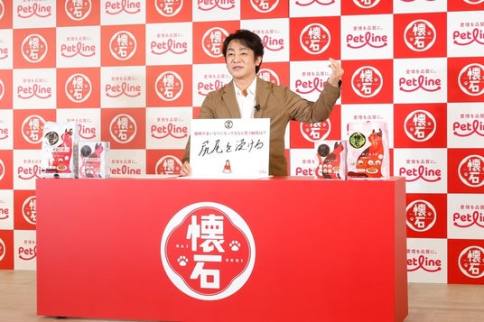 猫様の言いなりになっているなと思う瞬間について聞かれると、「お風呂に入っていると(まー之助くんが)浴槽の縁に乗ってきて、お風呂入りたいなと思うころになると尻尾を付けるんです。尻尾がベチャベチャになって、僕らとしては大変なんですけど、お風呂に入れてあげてます」とコメント。また、片岡さんにとって「猫」はどのような存在か尋ねられると、「猫様とは、家族ですね。やっぱり人間もそうですけど、寿命というものがあり、一日でも長生きしてほしいので、体にいいものを食べてほしいですね。懐石は美味しさを追求して幅広いフレーバー展開と機能性ラインアップを揃えており、おすすめです。」と熱弁しました。