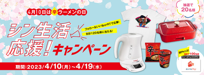 株式会社農心ジャパン(本社:東京都千代田区、代表取締役社長:金大廈)は、4月10日の「辛ラーメンの日」を記念して、2023年4月10日(月)~19日(水)までの期間、「シン生活応援キャンペーン」を開催します。新生活の忙しい日々を応援するため、期間中、SNSから応募していただいた方から抽選で、手軽に美味しく食べられる辛ラーメンシリーズの詰め合わせと新生活にあると嬉しい賞品のセットなど、豪華賞品をプレゼントします。