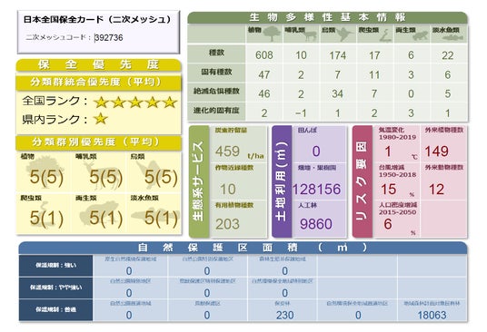 J-BMPで表示される、地点毎の生物多様性基本情報の例