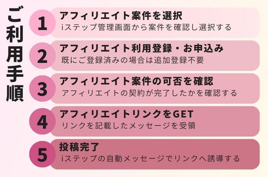 今回新機能として提供開始する「iステップアフィリエイト」は、iステップユーザーがiステップ管理画面上でご自身が興味あるアフィリエイト案件に簡単に申し込むことができるプラットフォームとなります。