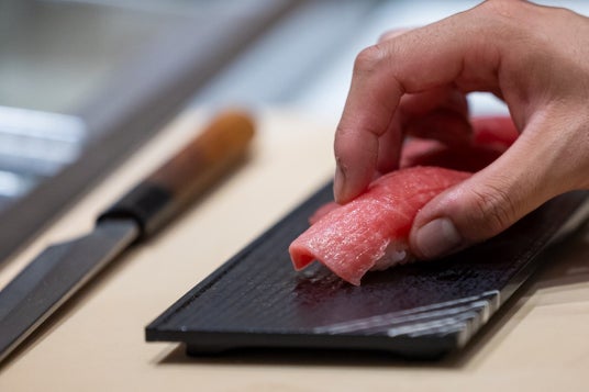 三崎恵水産では、まぐろ目利きのプロが選別。脂のりや身質等、常に最高品質のまぐろを仕入れる為、上質な本まぐろを追い求めて国内はもちろん、世界中から買い付けを行います。店舗では、寿司織人がまぐろ取扱いのプロとして管理をし、丹精込めた手しごとをします。水産事業から飲食事業まで一貫して携わり、プロの選別からプロの織人へと繋ぐことで、この一皿に「まぐろへの愛情」を表現しています。