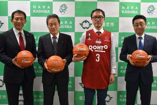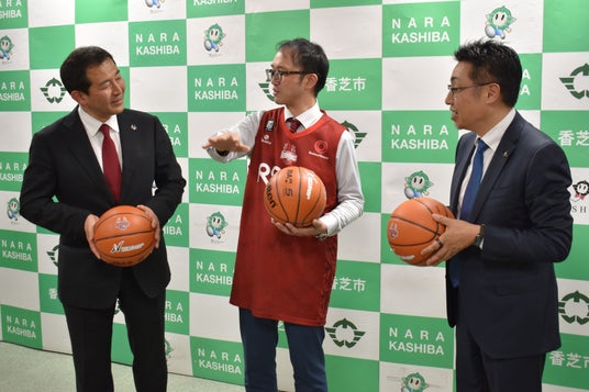 4月3日には、香芝市役所にてボール贈呈式が行われ、株式会社ヒロホールディングス様から香芝市へバスケットボールが寄贈されました。