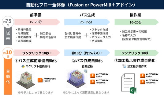 「Autodesk製品 CAD/CAM自動化支援サービス」は、これまで人手に頼っていたパス生成の事前準備から加工指示書作成までを、CAD/CAM/CAEなどの統合クラウドプラットフォーム「Autodesk Fusion」のAPI機能を活用し自動化することができます。テスト導入した企業では、1時間程度を要していた作業時間が、導入後は約10分まで短縮され、現場の負担軽減と業務プロセスの大幅な効率化を実現しました。