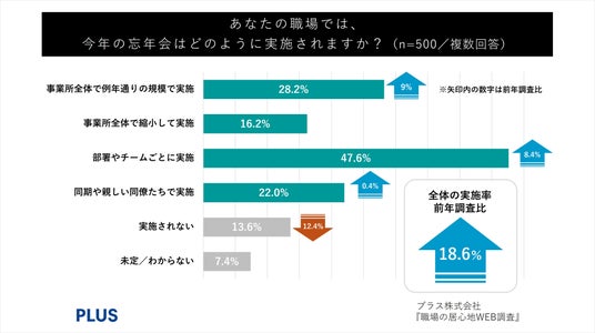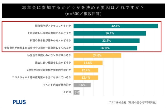 プラス株式会社ファニチャーカンパニー(東京都渋谷区)は、『職場の居心地WEB調査』と題し、デスクワークが中心の、オフィスワークとリモートワークの両方を行っている日本全国のハイブリットワーカー500名を対象に『忘年会』についてのWEB調査を実施いたしました。その調査結果を発表いたします。