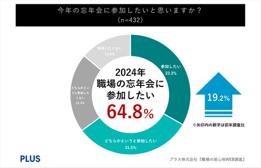 年末の訪れとともに、忘年会のシーズンも到来しました。交流という観点において、我々プラスとしても忘年会がどのような役割を担っているのか注目しております。今回の調査では「忘年会の予定」や「忘年会に参加したいと思うか」を中心にアンケートを行い、1年前に行った同様の調査結果との比較を行いながら、最新の動向をご紹介します。