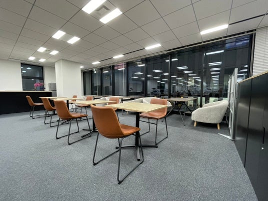 各フロアには、それぞれ2つずつガラス張りの会議室を配置。透明な仕切りがオフィス全体に広がり一体感を生み出し、円滑なコミュニケーションをサポートしています。会議室以外のデスクや椅子も、シンプルで落ち着いたデザインのものを選定し、全体的に無駄のないオフィス空間が広がります。