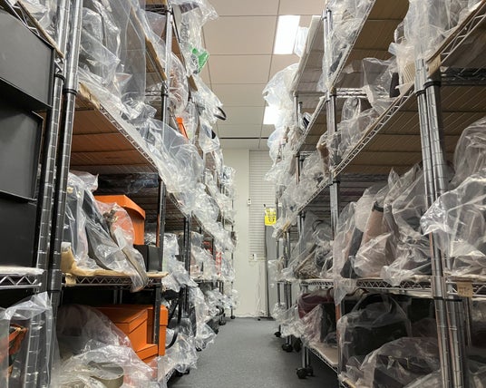 一方の5階は、オークション会場と商品のストックルームとして利用されています。現在、ペンギントレードが特に力を入れているオークション事業の拠点として設計されており、商品の陳列スペースは、手競形式のJRBオークションやオンラインオークションであるペンギンオークションの商品下見会場としても活用され利便性が高くなっています。また、ライブコマース事業でのライブ配信スペースとしても活用されストックルームからの商品運搬を考慮したスペースの合理化と機能性の両立を実現しています。