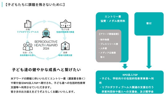「リプロダクティブヘルスアワード」は、アワードを通して、リプロダクティブヘルスに関連する優れた取り組みや人、学生、学校、団体、商品・サービス、企業等を表彰していきます。「自分と他者を尊重する健やかな社会の革新に光を当てる」ことをテーマに、優れたモデルとなる取り組みを共有することで、社会全体のリプロダクティブヘルスへの理解を加速させたく、性や子どもを持つことに関するすべてにおいて誰もが自分らしく生きられる未来を創ることに貢献していきます。