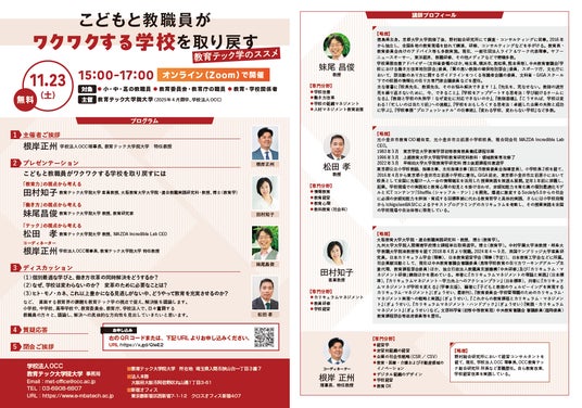 教育テック大学院大学(所在地:埼玉県入間市狭山台/学長:竹村治雄、以下教育テック大学院大学)は、2024年11月23日(土・祝)15:00より、オンラインシンポジウム『こどもと教職員がワクワクする学校を取り戻す~教育テック学のススメ~』を開催します。