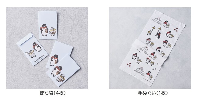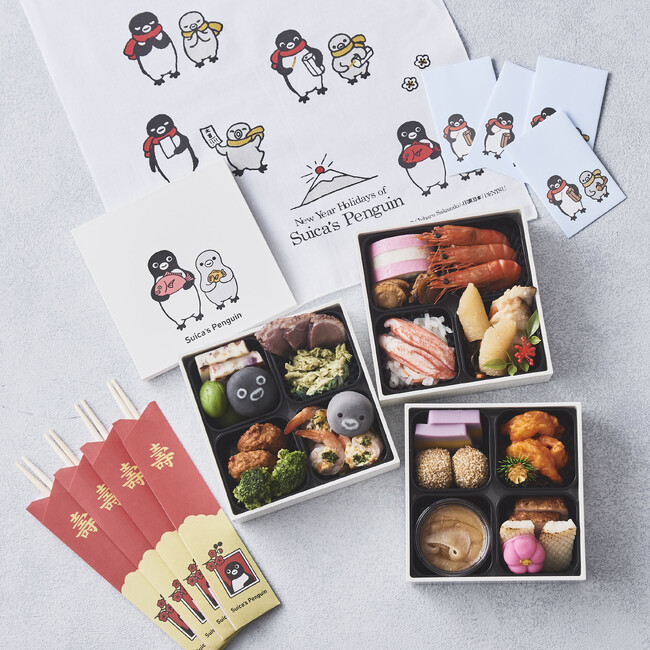 〇年始を彩るおめでたいデザインのお重や、年始の行事を楽しむSuicaのペンギンたちがデザインされた手ぬぐい、ぽち袋、祝箸は全てオードブル限定の特典です。