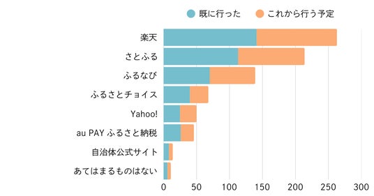 楽天:263名 さとふる:213名 ふるなび:139名 ふるさとチョイス:67名 Yahoo!:50名 au PAY ふるさと納税:46名 自治体公式サイト:14名 あてはまるものはない:11名