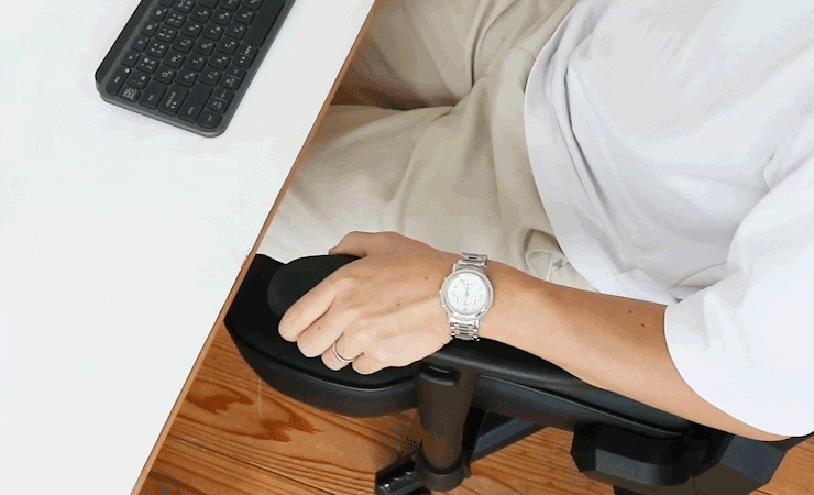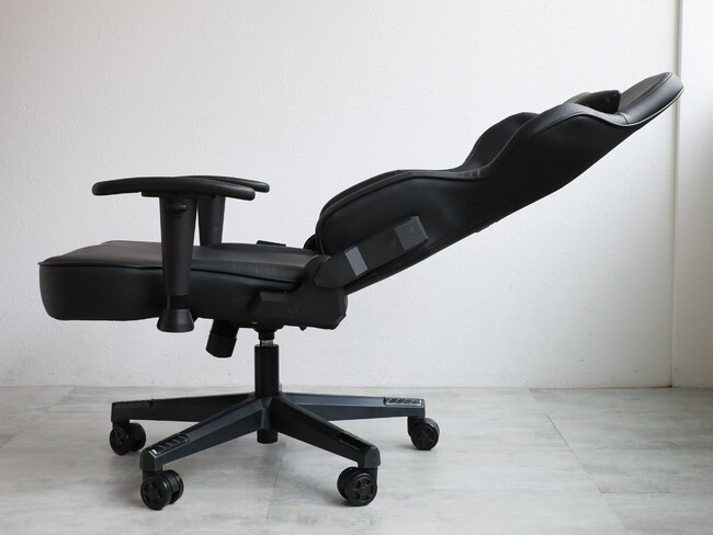 また「あぐらをかく時にアームレストが邪魔になる」問題も、可動式アームレストを『ハの字』に開くことで解決します。