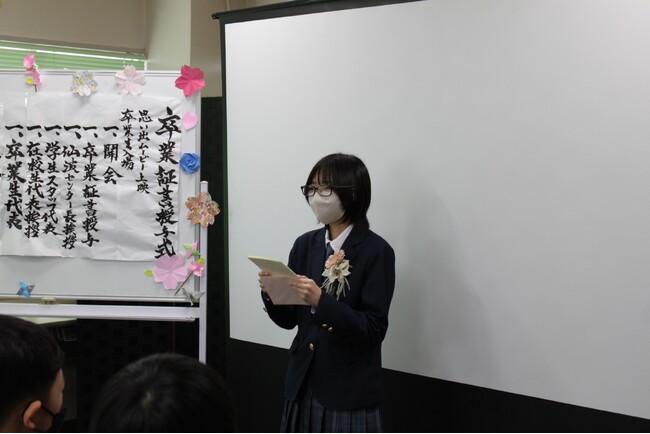 卒業生代表挨拶では、中学3年生のNさんが、学校に行けなくなった時に寄り添い支えてくれた保護者、センターで出会ったスタッフや友人への感謝の言葉や、センターで様々なことに挑戦したことでできた将来の夢を、ここでの様々な思い出と共に語ってくれました。