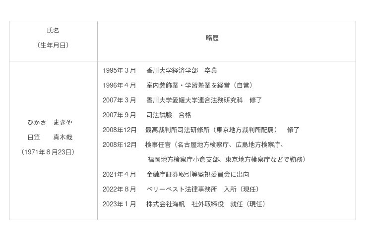 日笠真木哉氏は、元東京地検特別捜査部の検事として大企業における特別背任事件、インサイダー事件など、多数の財政経済事件の捜査・公判を担当するなど全国各地で活躍されました。また、金融庁証券取引等監視委員会にてインサイダー取引や相場操縦を対象とする行政調査を指揮するなど、企業法務に関わる深い知見をお持ちです。日笠氏をお招きし、当社におけるガバナンス体制の一層の強化を図ることを目的としております。