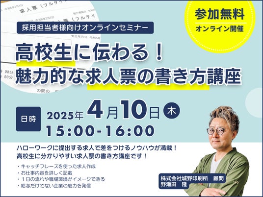 株式会社城野印刷所(本社:熊本県上益城郡益城町、代表取締役社長:城野斉、以下、当社)は、2025年4月10日(木)に無料オンラインセミナー「高校生に伝わる!魅力的な求人票の書き方講座」を開催します。