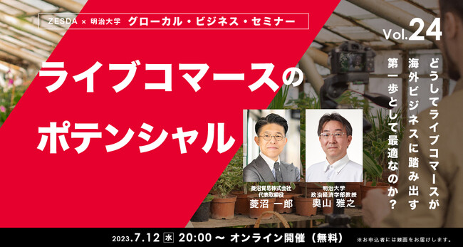特定非営利活動法人ZESDA(代表理事:桜庭大輔、所在地:東京都中央区、以下NPO法人ZESDA)は、2023年7月12日(水)に『グローカル・ビジネス・セミナーvol.24』を開催します。今回は、日本商材の海外展開の現場に長く携わっておられる菱沼貿易株式会社 代表取締役 菱沼一郎(ひしぬま いちろう)さんに「ライブコマースのポテンシャル」というテーマでお話いただきます。