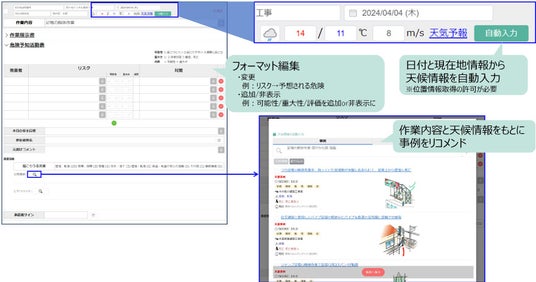命に関わる熱中症の危険性が増加するとともに、急な突風・雷雨など、気候変動も年々大きくなる傾向が続き、天気情報をリアルタイムで考慮した安全管理がより重要となっています。そこで、作業現場の位置情報に天気予報情報をリンクさせることで、安全管理に関わる天気・温度・風速などの環境情報を、作業指示書・危険予知活動表などの関連帳票に半自動で反映できるようにしました。それらの帳票に記入された作業内容と天候情報を組み合わせ、AIがより関連度の高い災害・品質トラブルとその対策情報を推奨することで、状況に合わせて最適な情報をジャストインタイムで提供できるようにしました。
