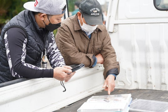 軽トラックの荷台で打ち合わせをする小山さんと松元さん(左)