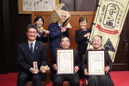 国富町法ヶ岳地区で1200年前から受け継がれてきた法華岳うずら車の製作者、小山五雄さんが宮崎県の伝統工芸士として認定され、2月20日、河野俊嗣宮崎県知事から認定証が手渡されました。
