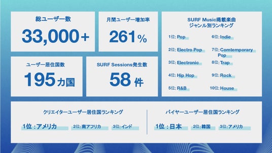 現在、SURF Musicの総ユーザー数は約33,000人に到達。ユーザーは195か国に分布しており、昨年の53か国から大幅に増加しました。また、月間平均ユーザー増加率は261%と飛躍的な成長を遂げています。