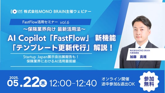 カスタマーサポート(CS)領域のAIソリューションを提供する株式会社MONO BRAIN(本社:東京都渋谷区、代表取締役:加藤真規)は、2025年5月22日(木)12時より、保険業界の皆様を対象とした無料オンラインウェビナー「「FastFlow」最新活用法ウェビナー (vol.6)」を開催いたします。