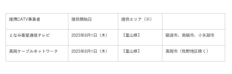 株式会社NTTドコモ(以下、ドコモ)は、光インターネットサービスの「ドコモ光 タイプC」において、対象となる提携ケーブルテレビ事業者(以下、提携CATV事業者)に、となみ衛星通信テレビ株式会社(以下、となみ衛星通信テレビ)、高岡ケーブルネットワーク株式会社(以下、高岡ケーブルネットワーク)の2社を2023年6月1日(木)から追加します。今回の提携により、「ドコモ光 タイプC」の提携CATV事業者は全国で40社となります。